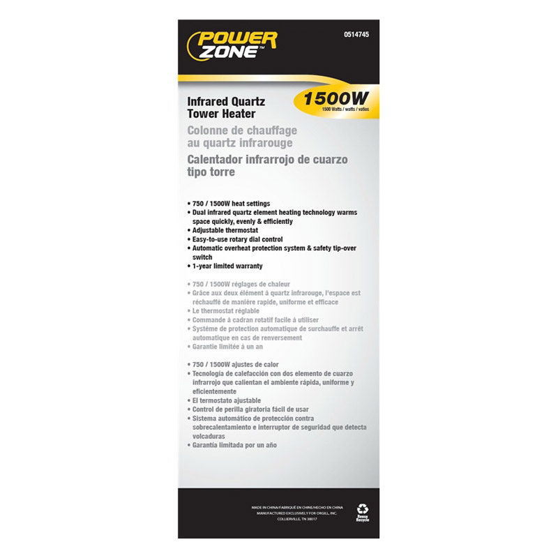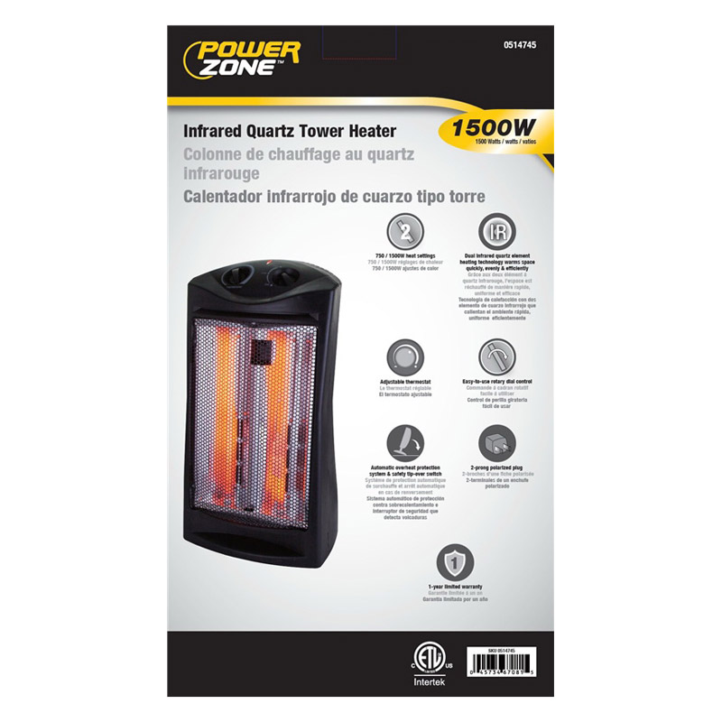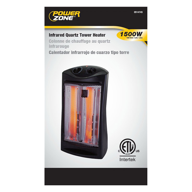 Infrared quartz Tower Heater, 750/1500 W heat settings. Dual infrared quartz element heating technology warms space quickly, evenly and efficiently. Adjustable thermostat. Easy-to-use rotary dial control. Auto-matic overheat protection system and safety tip-over switch.