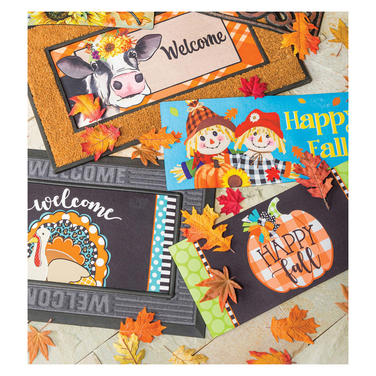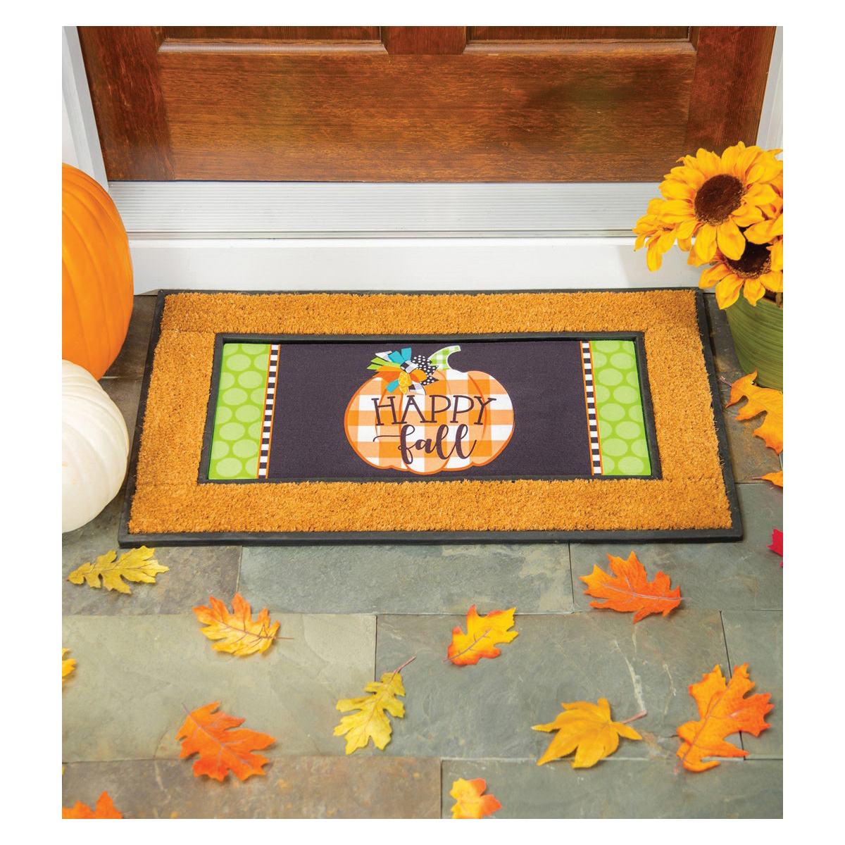 Add a splash of color to your autumn entryway with this Happy Fall Pumpkin Sassafras switch mat. Guests will be greeted by a "Happy Fall" message shown on an orange and white checkered pumpkin adorned. A colorful bow, striped details, and green polka dot borders add a touch of charm to this festive design. The durable insert is for placement in a Sassafras mat frame or tray, sold separately. Swap mats seasonally to keep things fresh and fun. The charming design is heat sublimated onto the polyester and rubber insert. Suitable for indoor and outdoor use, the floor mat can also be used on its own as a stair tread or small floor mat. It is mildew resistant and features an anti-slip backing. Spot clean with soap and warm water or hose down. For best results, display your mat in a covered or sheltered area to prevent fading.