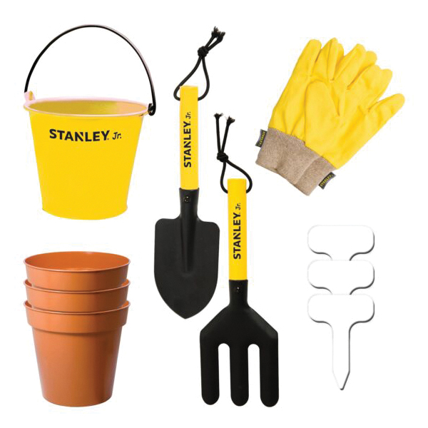 Complete 10-piece set - the Stanley Jr 10-piece garden tool set provides everything your children need to kick start their gardening adventures. with a hand trowel, hand fork, watering pail, gardening gloves, plant labels and plastic pots included, this set offers a comprehensive collection of tools to keep them engaged and occupied for hours. Encourage gardening exploration - this tool set is designed to ignite your children's curiosity and love for gardening. with a variety of tools at their disposal, they can explore different aspects of gardening, from planting seeds and transplanting seedlings to watering and caring for their plants. It's a great way to foster a deeper connection with nature and encourage hands on learning. Quality Stanley Jr tools - the Stanley Jr brand is renowned for its quality and craftsmanship and this garden tool set lives up-to that reputation. Each tool is designed with durability and functionality in mind, ensuring they can withstand the rigors of outdoor play while remaining comfortable and easy to handle for young gardeners. Promote learning and responsibility - gardening is a fantastic educational activity for children and this set enhances the learning experience. Your children will not only develop practical gardening skills but also learn about plant life cycles, the importance of soil and water and the rewards of nurturing living things. It also instills a sense of responsibility as they take ownership of their garden. Expand creativity and imagination - with this garden tool set, your children can unleash their creativity and imagination. They can design their own garden layout, create personalized plant labels and arrange the plastic pots to showcase their favorite plants. This promotes artistic expression and allows them to take pride in their gardening accomplishments.