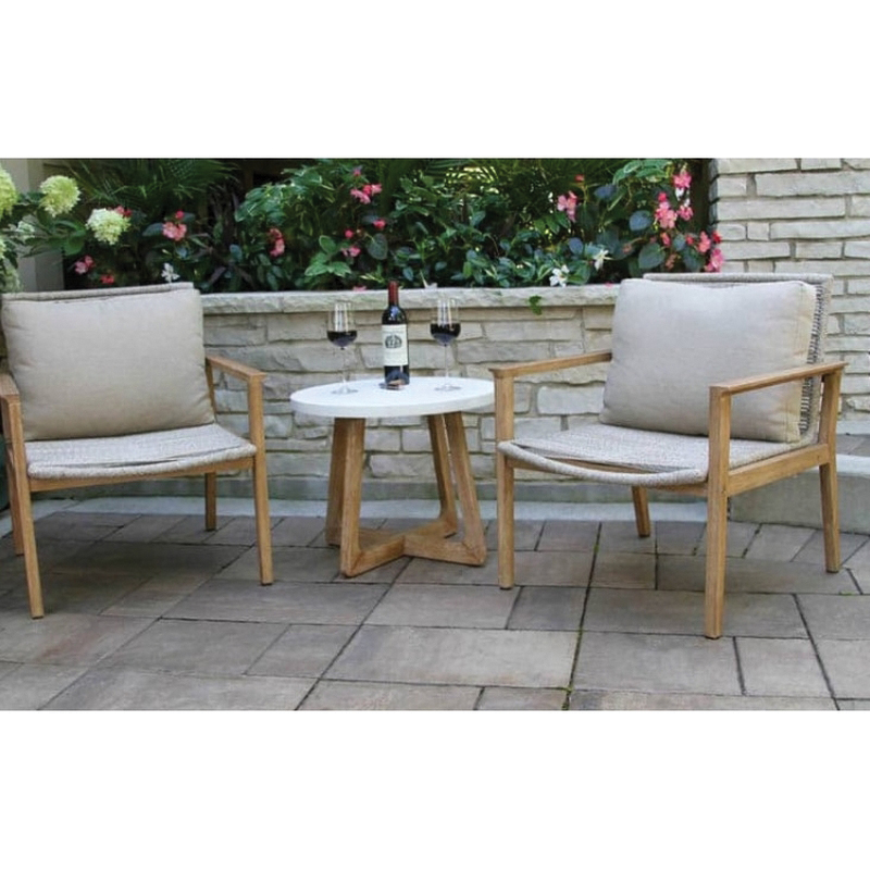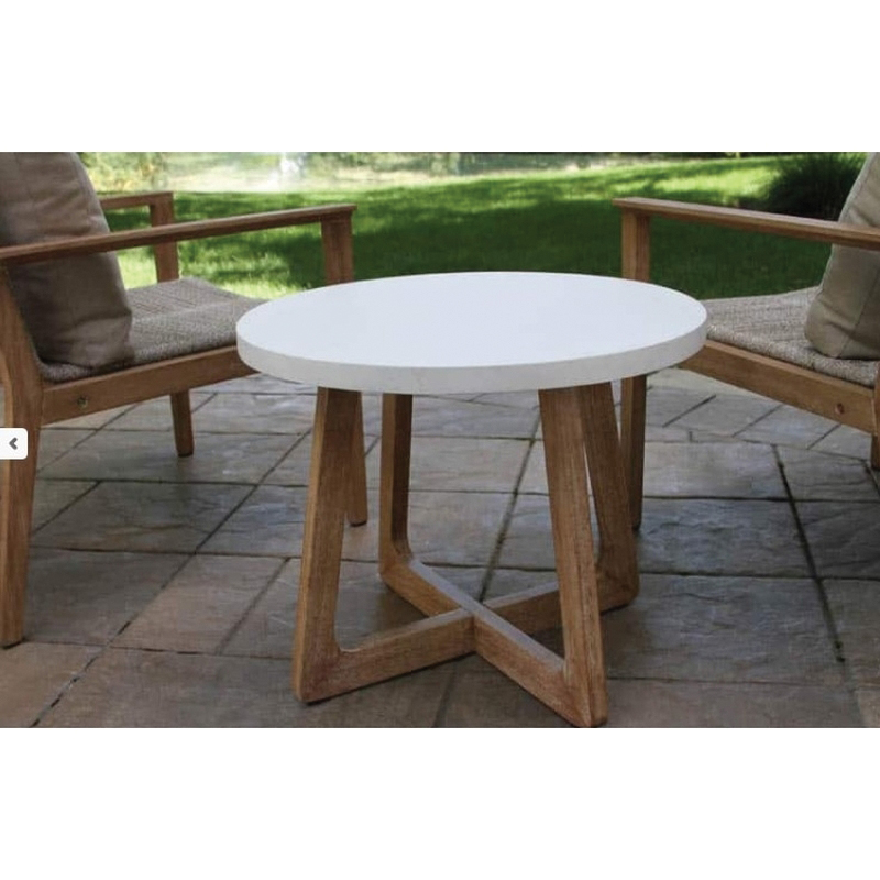 The outdoor interiors round ivory composite and eucalyptus wash 24 in Dia x 20 in H accent table adds a modern coastal feel to any outdoor setting. The ivory composite top accent table is made from a poly-resin and powdered concrete blend for texture and density. This mixture is molded into a powder-coated steel frame for support and stability, built for long-lasting durability in all climates. Our materials and construction process provide lasting durability, which separates us from similar-looking products in the marketplace. The table base is gently brushed for texture and then stained and washed in a beautiful UV inhibited lasting finish. The table includes adjustable ft for uneven surfaces. It displays well on patios and decks with our matching chairs, benches and loungers.