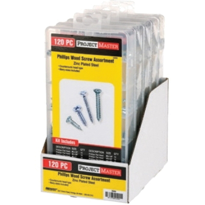 Midwest Fastener Screw Assortment, Specifications: Phillips Drive Type, Countersunk Head Type, Wood Applicable Materials, Steel, Zinc, Number of Pieces: 120, Includes: (10) #6 x 1/2, (10) #6 x 3/4, (10) #6 x 1, (10) #8 x 1/2, (10) #8 x 3/4, (10) #8 x 1, (10) #8 x 1-1/4, (10) #10 x 1/2, (10) #10 x 3/4, (10) #10 x 1, (10) #10 x 1-1/4 and (10) #10 x 1-1/2 Screws